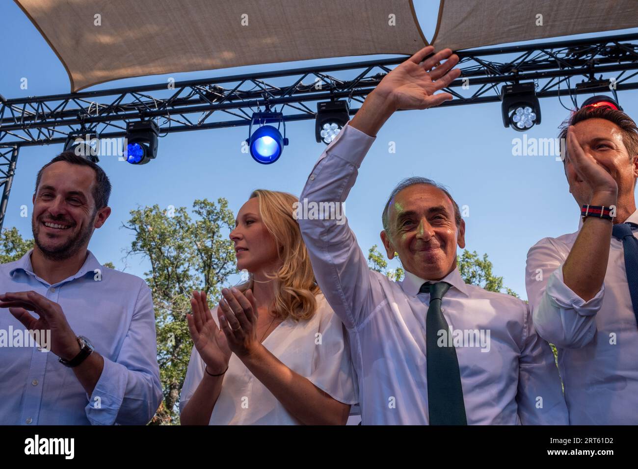 Greoux Les Bains, France. 10th Sep, 2023. A stand with propaganda